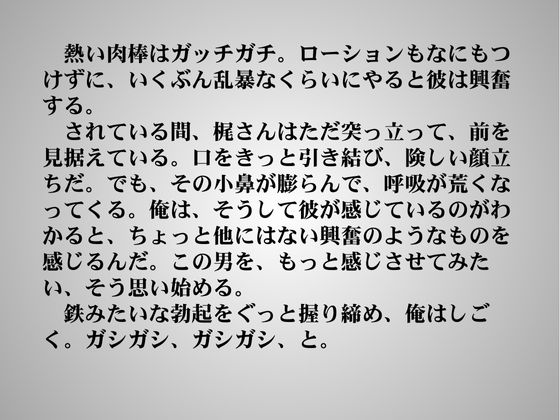 ほぼエロシーンのみ! シチュエーションだけで、めんどうなストーリーはありません。長編でも読み返すのは結局エロいところだけだな……と思ったので、読みたいと思えるものだけを凝縮しました。短いですが、そのぶん濃厚。男が感じる姿を文章でじっくり描写し、淫語にこだわった濃厚なエロ表現とセリフをこってり詰め込みました。また、さし絵を含まない文章作品なのでビジュアルは想像どおり、100%好みに合ったイメージの世界をジャマしません。ヌキたいときにサッと読めて即クライマックス! 使い勝手のいいショートノベルをお楽しみください。